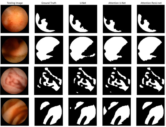Figure 7, we demonstrate some qualitative endoscopic lesion segmentation findings from the MICCAI 2017 test set acquired by using several approaches. The four original images show varied lesions in regard to appearance and size, and there are no apparent structural borders between normal and lesion areas. Furthermore, certain areas with poor quality make data analysis difficult. All of these present challenges in distinguishing aberrant from normal areas. However, we can observe that the segmentation of our suggested AttResU-Net is close to the ground truth. On the contrary, other methods can capture big abnormal regions successfully but may miss certain tiny abnormal regions.