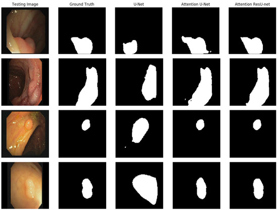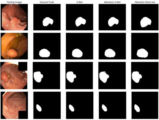 Figure 8. It is clear that all of the algorithms can detect polyps and provide high-quality masks. The best segmentation results are achieved for AttU-Net and AttResU-Net, especially for minor details, as seen in the first example. On basically all samples, our suggested network yields comparatively better predictions.