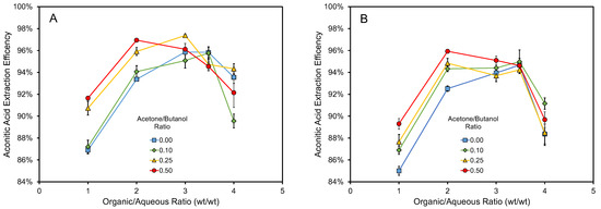The extraction efficiency of the solvents to extract aconitic acid from the syrups is shown in Figure 1. As noted, the maximum extraction efficiency was obtained using an approximately 2–3.5 organics:syrup phase weight ratio. A slightly higher extraction efficiency was obtained when extracting aconitic acid from the commercial syrup than when extracting aconitic acid from the non-commercial syrup. Overall, 92–96% aconitic acid was extracted with the 2–3.5 organics:syrup ratio; and generally, the extraction efficiency increased as the acetone:butanol ratio in the solvent phase increased (Figure 1). The results compared well with Gil Zapata [11], who tested solvents for the extraction of aconitic acid from fermented and distilled sugarcane juice and molasses. He reported an extraction efficiency of 90% when pure butanol was used at pH 2.0 with an organic:aqueous ratio of 3.5. Others [15] have obtained a high extraction efficiency using amine- or phosphorous-based solvent systems, in combination with chloroform, xylene, hexane, etc. The best solvent systems extracted over 98% of the aconitic acid from sugarcane molasses at pH 1.5–1.6 [15].