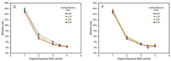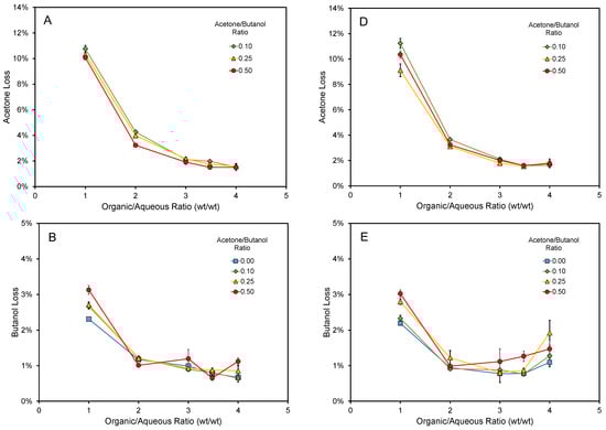 Solvent loss to the syrup phase during extraction with different ABE mixtures and different solvent:syrup ratios. Acetone, butanol, and ethanol losses for commercial syrup are shown in (A), (B), and (C), respectively. Acetone, butanol, and ethanol losses for non-commercial syrup are shown in (D), (E), and (F), respectively. The loss was calculated using the difference of the solvent species present in the syrup before and after solvent extraction, accounting for weight changes to the phases after extraction. Error bars represent standard errors.
