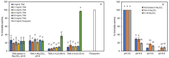 Nematicidal assays with TAA, TAA extract, and buffer against C. elegans. (A) The crude TAA extract, TAA in 0.1 M Na2CO3, and TAA solutions in water without pH adjustment. Fluopyram was used as control treatment. (B) The crude TAA extract, TAA in 0.1 M Na2CO3, and Na2CO3 control, adjusted to pH 3 to pH 6. Unless specified, the assays were carried out for 48 h. Percentage immotile includes dead worms. Significant differences between different treatments at the same condition in 3A and between any condition in 3B are represented by different letters above standard error bars.