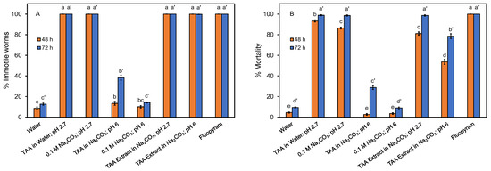 The crude TAA extract was tested as a potential nematicide based on results previously reported by Du et al. [9]. The same results were obtained with the TAA extract and the TAA standard in Na2CO3 buffer at all TAA concentrations studied, resulting in approximately 22% immotile worms (Figure 3A, bar grouping 1 and 2). Less nematocidal activity was observed in assays with solutions of TAA in water, except in the case of 2 mg/mL TAA, where approximately 36% immotile worms were observed at 48 h (Figure 3A, bar grouping 3), which increased to 97% at 72 h (Figure 3A, bar grouping 4). Upon further investigations, it was determined that the extract preparation included neutralization with Na2CO3 and had a significant buffering capacity. While the buffering capacity was also present in the nematode growth medium, the pH was low (e.g., pH 2.7 with 2 mg/mL of TAA) in the final assay conditions when TAA in water was tested. The pH of the final assay solution was approximately pH 6 when the TAA extract was tested. Thus, it was speculated that pH may have a strong impact on the effectiveness of TAA against the nematodes.