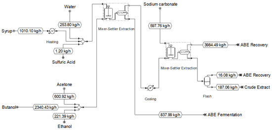 The process design, sizing of equipment, and cost estimation were performed using SuperPro Designer, Version 11.2 (Intelligen, Scotch Plains, NJ, USA). The annual production of the sweet sorghum syrup, containing 65% (wt/wt) total dissolved solids (mostly sugars) and 1.2% aconitic acid was assumed to be 8,000,000 kg. This is representative of a small-sized but commercial production of syrup [40]. While this amount is generated during a short harvesting season (approximately 4 months), it was considered to be stored and available at a flow rate of 1010 kg/h for 7920 h. The syrup was heated, diluted to 50 °Brix (~50% dissolved solids), and pH adjusted to pH 2.5 before extraction with an acetone:butanol:ethanol (ABE) mixture (19%:74%:7%); a mixture found to be optimal in the preliminary studies. The organic and aqueous phases were separated, after which the aconitic acid in the organic phase was cooled and back-extracted with sodium carbonate (0.4 M). This was followed by flash evaporation to partially remove additional solvents for ABE recovery. The spent organic phase (containing most of the ABE) was processed for the recovery of ABE for extraction reuse (not modeled here). The ABE recovery was recently reported elsewhere [23,24,25,26,27]. The aqueous phase, containing approximately 50% sugars, can be used for an ABE fermentation (not modeled here). Any remaining unused solvent streams are passed on to solvent separation and recovery. The value of the sugar and ABE stream was valued at USD 0.46/kg of sugar [41] and 10% of the price of ABE. The prices of acetone, butanol, acetone, sodium carbonate, and sulfuric acid were obtained from Intratec [42]. All prices were adjusted to 2022 prices using the producer price index [17]. Other costs such as materials, labor, facilities, etc., were obtained directly from the SuperPro Designer software.