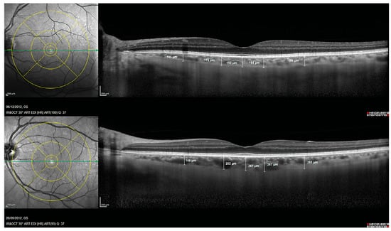 Choroidal thickness measurements assessed with spectral domain optical coherence tomography in a patient with Alzheimer’s disease (Top) and in a control subject (Bottom). Reprinted from [53], Copyright 2014, with permission from IOS Press.