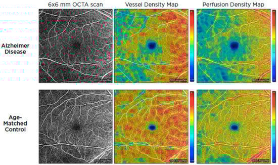 Optical coherence tomography systems can now obtain a retinal angiogram using a noninvasive approach known as OCT angiography (OCTA), which can offer depth-resolved volumetric details on the choroidal and retinal microcirculation by detecting the movement of flowing red blood cells and reconstructing them in structural pictures using sequential OCT scans. Given the similarity and continuity of cerebral and retinal vasculature, OCTA could be used to identify microvascular alterations in Alzheimer’s disease through retinal blood flow [57,58]. These alterations are thought to be the result of beta-amyloid plaque formation in the retina. Amyloid plaques may put pressure on retinal layers and vasculature, producing reduced blood flow, lower oxygen levels, and a lack of glucose and other nutrients. As a result, the hypoxic retina reacts by generating VEGF to encourage angiogenesis and reestablish its blood supply. Nonetheless, β-amyloid plaques restrict angiogenesis by functioning as a mechanical barrier to VEGF release, trapping it inside the plaques and blocking VEGF from reaching surrounding healthy retina [59]. In 2018, O’Bryhim et al. noted that Aβ-positive preclinical patients had a greater foveal avascular zone (FAZ) on their OCTA in comparison to healthy people [60]. Subsequent studies by Zhang in 2022 demonstrated FAZ changes were also related to medial temporal lobe atrophy (MTA) scores in individuals with early-onset dementia (EOD), whereas retinal microvasculature was correlated with white-matter hyperintensity [61]. Additionally, patients with AD and cognitive impairment have been found to have lower retinal capillary vessel density as well as flow density compared to controls [62,63,64,65,66,67,68] (Figure 4).