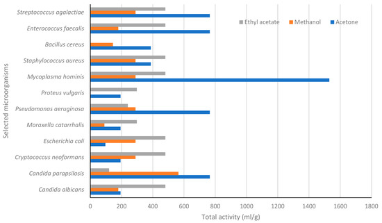 The total activity (mL/g) of various Cissus cornifolia extracts against selected microorganisms.