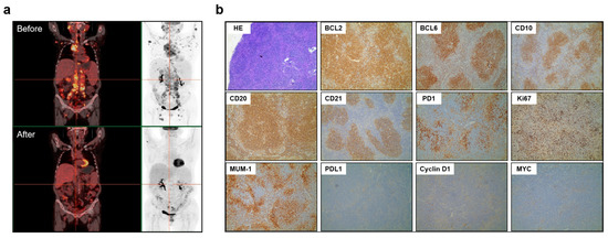 The patient was accordingly diagnosed with FL (low-grade) stage IV, group B (Follicular Lymphoma International Prognostic Index (FLIPI), 5 points, high risk). At this point, the patient’s performance status was ECOG1. After four cycles of R-CHOP (rituximab, cyclophosphamide, doxorubicin, vincristine, and prednisone), interim evaluation using enhanced CT showed partial remission. The patient achieved a satisfactory response after six cycles of R-CHOP (evaluated using PET/CT) (