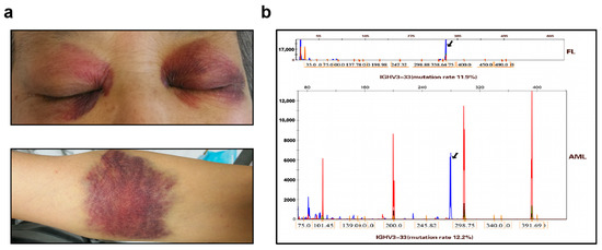 We next analyzed a FL tissue sample and an AML peripheral blood sample to detect the immunoglobulin heavy-chain variable region (IGHV) gene rearrangement. The FL sample showed the highest homology with IGHV3-33, with 88.1% identical nucleotide sequences. Sequencing of the transformed myeloid leukemia sample showed the highest degree of homology at IGHV3-33, with 87.8% identical nucleotide sequences (