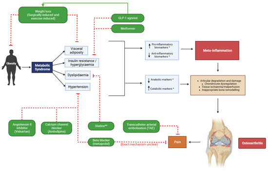 Figure 1. MetS-OA proposed therapeutic strategies targeting constituent pathologies. * See Table 1. for specific biomarkers. ** Higher statin dosages may be associated with progression of OA [47]. Created with BioRender.com [71].