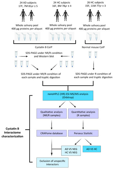 Twenty-four subjects affected by AD were recruited at the Neurology Department of the “Fondazione Policlinico Universitario A. Gemelli”, Catholic University of the Sacred Heart, Rome (17 females and 7 males; 81 yr ± 5; mean age ± standard deviation (SD)). Thirty-four volunteers were enrolled as healthy controls; twenty-four healthy control subjects were considered the positive control group (HC) to be compared with the AD group; it was composed of 16 females and 8 males (78 yr ± 4; mean age ± SD) chosen to match the AD group in number, sex, and age; twenty-six HC subjects were considered the experimental negative control (NEG) in the AP-MS experiments. The NEG group was composed of 15 females and 11 males (77 yr ± 3; mean age ± SD). To increase the heterogeneity of the NEG group, sixteen subjects (11 females and 5 males) were the same as those included in the HC control group, and ten subjects (4 females and 6 males) were not included in the HC group. The schematic summary of the experimental design applied in this study to characterize the salivary interactome of cystatin B is shown in Figure 1. Demographic features of the subjects are shown in Table 1. Donors, either healthy volunteers or patients, were non-smokers and did not show pathological alterations of the oral cavity during saliva collection. The informed consent process was based on the latest stipulations established by the Declaration of Helsinki, and the study was approved by the formal ethical committee of the Catholic University of the Sacred Heart, Rome (protocol number 3457). The AD diagnosis was determined according to standardized criteria [33] and included both moderate (n = 8) and mild (n = 16) AD patients. Patients’ pharmacological treatment and clinical features are reported in supplementary Table S1.