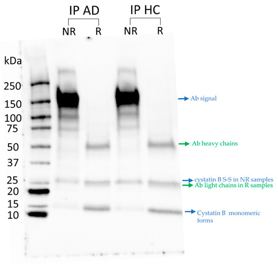 Western blot with cystatin B antibody after CoIP assays of whole saliva pools from 24 AD patients and 24 HC subjects (Table 1) in NR and R samples. Arrows indicate what each signal refers to.