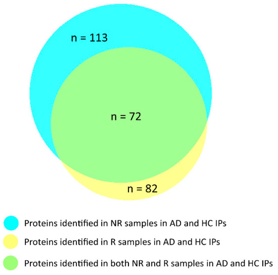 Venn diagram of the proteins identified in AD and HC IPs in NR and R samples.