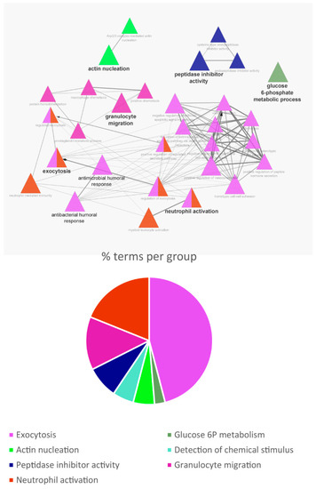 For the pathway analysis, only the proteins identified in the R samples (#82, cystatin B included) were considered. The analysis of significant biological pathways in which cystatin B and its 81 interactors participate is shown in Figure 4. The data indicated that PPIs among these proteins involved the following biological processes: exocytosis, granulocyte migration, and neutrophil activation, with minor participation in actin nucleation, peptidase inhibitor activity, and glucose metabolism. The analysis performed by the STRING tool showed that the 82 interactors were ubiquitous proteins, although those typically localized in the blood system and in the oral cavity showed the best significance of the FDR. The detailed information obtained by STRING analysis is reported in Supplementary File S2; only proteins with significant strict FDR (<0.01) were considered and indicated with the gene name.