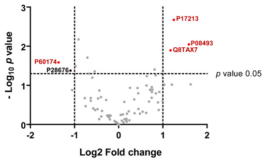 The results of the quantitative comparison of cystatin B and its 81 partner levels between AD and HC IPs are shown in Table 3 and in the volcano plot in Figure 5. The p-values and fold changes of the proteins with significant different abundances between AD and HC are indicated in Table 3. Triosephosphate isomerase (TPI) exhibited a lower level in the AD group, while significantly higher levels of bactericidal permeability-increasing protein (BPI), matrix γ-carboxyglutamic acid–rich (Gla) protein, and Mucin-7 (MUC-7) were found. A fifth protein, grancalcin, was individuated by a volcano plot with a slight abundance difference between AD and HC groups; a -Log10 p value of 1.4 (0.04) and a Log2 of fold change −1.1 (0.5) were calculated by the statistical analysis. Even if the fold change is good, the low significance of the p value made us consider the protein borderline.