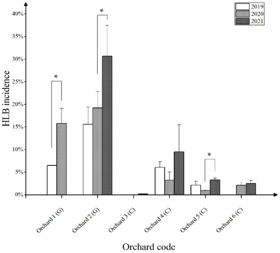 Statistical chart of Huanglongbing (HLB) incidence in the six orchards of the Guangdong Province from 2019 to 2021. G: general management; C: comprehensive control management. The data represent the means ± SD. * p < 0.05; (ANOVA with Tukey’s post hoc test).