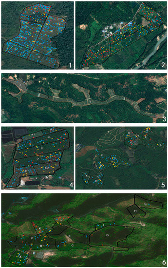 Distribution of the diseased trees in the orchards. The subfigure 1–6 correspond to the topographic of orchard 1–6 respectively. Letters A to L were different regions of the groves. The blue dots indicate scale 1 trees, that with 1/3 canopies of each tree affected by HLB. The yellow dots mean scale 2 trees, where more than 1/3 and less than 2/3 canopies of each tree were symptomatic. The red dots represent scale 3 trees, with more than 2/3 canopies affected by HLB. The codes of the groves are in accordance with those in Table 1.
