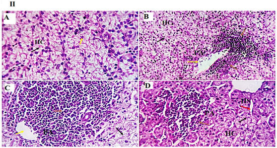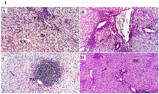 58]. The other signaling messengers, such as IL-1, IL-2, IFN-γ, and TNF-α, may also be included in the immuno-regulating system. The results of liver histopathology confirmed these findings, wherein moderate-to-high peri-portal lymphocytic aggregation was observed in the GLC100 and GLC150 groups. The accumulation of portal inflammatory cells appears to be a highly resistant and defensive mechanism rather than a destructive inflammatory process.