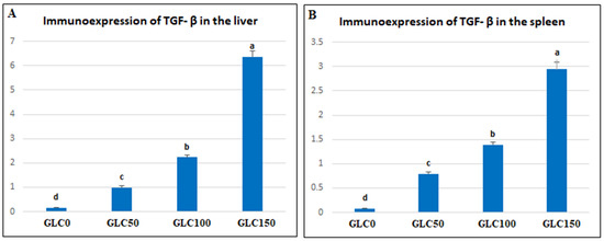 Regarding the inflammatory responses in broiler chickens fed with a GLC-supplemented diet, the results showed increased serum levels of IL-1β and IFN-γ in the GLC-fed groups in a concentration-dependent manner. Moreover, dietary GLC supplementation increased TGF-β immunoexpression in chicken liver and spleen tissues in a concentration-dependent manner. Proinflammatory cytokines (interferon-γ and IL-1β), which are essential immune proteins, are endogenous signaling molecules that facilitate cellular defense against inflammatory response [