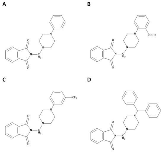 In this study, we have chosen four phthalimide derivatives: A, B, C, and D (Figure 1) for analysis, previously described in work [3]. The final products A–D were obtained by aminoalkylation of the acidic proton on the imide nitrogen atom of the isoindoline-1,3-dione. The reaction was carried out for several hours using aqueous formaldehyde and the appropriate arylpiperazine under reflux tetrahydrofuran. Final products A–D were obtained in good (47.26%-C, 58.92%-D) or very good (76.87%-A; 92.91%-B) yields. Spectral studies of FT-IR, NMR (1H, C13) as well as elemental and mass analysis MS/MS and ESI-MS confirmed the structure and homogeneity of the obtained derivatives, which was supplemented by a fragmentation study identifying the presence of molecular quasi-ions. To investigate the interaction between analyzed N-Substituted 1H-isoindole-1,3(2H)-dione analogs and proteins, we have used several spectroscopic methods such as UV–Vis spectroscopy, circular dichroism (CD) spectroscopy, fluorescence spectroscopy, and FT-IR spectroscopy. Furthermore, all analyzed interactions will also be investigated using a molecular modeling study. All theoretical and analytical methods used will allow for determining the way the tested phthalimide analogs interact and whether they bind to plasma proteins.