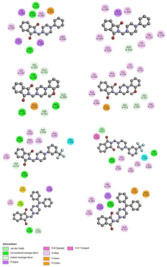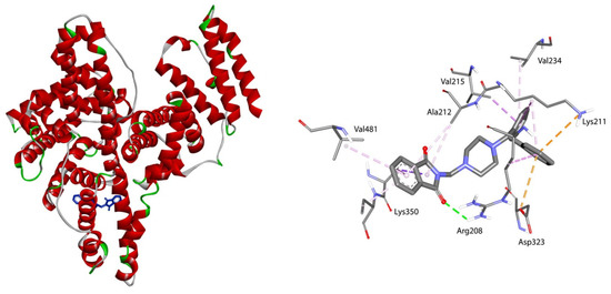 The location of phthalimide derivative D in the bonding cavity of drug site II is shown in Figure 2. Compound D interacts with BSA by hydrogen bonds between Arg208 and the oxygen atom from the carbonyl group. The isoindoline-1,3-dione moiety is surrounded by Ala349, Ala212, Lys350, and Val481. π-σ and π-alkyl contacts are detected. A set of two benzene rings forms hydrophobic interactions with Val215 by π-σ contact, with Val234, Lys211, and Arg208 by π-alkyl, and with Lys211 (π-cation) and Asp232 (π-anion). For compounds A-C, all parts of the molecule, isoindoline-1,3-dione part, piperazine ring, and phenyl group interact with BSA in site II. An illustration of a type of interaction is presented in Figure 3 (right). In site I, hydrogen bonds play an important role with oxygen atom from the carbonyl group. Compound A binds to BSA via Tyr144, Arg217, Arg256; compound B binds by Tyr156, Arg194, Arg198; compound C binds by Arg148, Arg194; and compound D binds by Lys294. All complexes are additionally stabilized by hydrophobic and Van der Waals contacts (Figure 3, left).