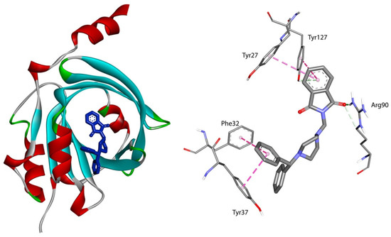 On the left—the position of phthalimide derivative D (blue) in GG active pocket; on the right—the 3D view of binding mode.