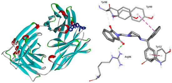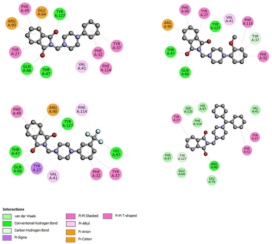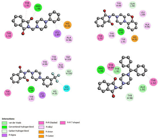The docking analysis indicated that the strongest interaction with gamma globulin is observed for phthalimide derivatives C and D, −35.09 and −35.12 kJ·mol−1, respectively. The location of compound analog D in the active site of GG is presented in Figure 6. Only one hydrogen bond between Arg96 and the oxygen atom from the carbonyl group is observed. The complex is further stabilized by hydrophobic interactions π-π stacked and π-π T-shaped between Tyr32, Tyr99, and two benzene rings. The Arg98 residue forms hydrogen bonds with the carbonyl group also in complexes with A, B, and C. The π contacts are observed. The details are presented in Figure 7.