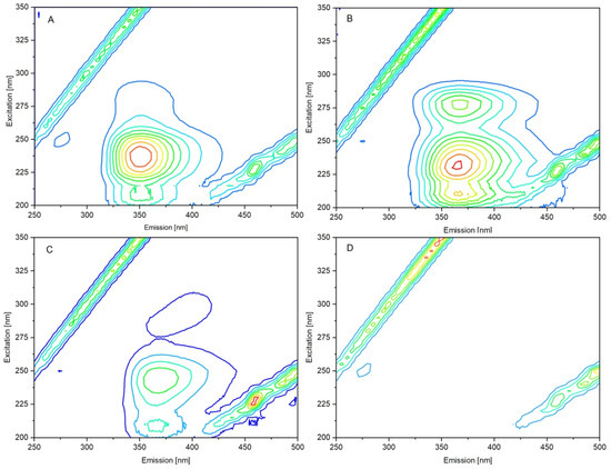 To determine the fluorescence behavior of studied compounds in phosphate buffer solution, a three-dimensional fluorescence spectroscopy measurement was performed. The spectra were recorded with excitation wavelengths set to 200–350 nm, and emission wavelengths set to 250–500 nm. Obtained contour plots are presented in Figure 8. As it has been shown, compounds A, B, and C have fluorescence properties in the studied excitation range. The λex/λem were determined as 237/351, 232/367, and 243/370 for A, B, and C, respectively. Compound D showed no fluorescence properties.