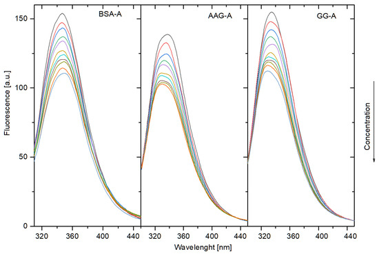 To determine the nature of the interaction of the tested compounds with plasma proteins, fluorescence quenching was used. It is a simple, widely used method leading to good and reliable results. Due to the intrinsic fluorescence of compounds A–C and overlapping emission spectra with Trp and Tyr residues, as mentioned above, the excitation wavelength was selected as 300 nm. Bovine serum albumin has two Trp residues: Trp-134 and Trp-213. The first one is located in the subdomain IA, on the surface. The second is located in subdomain IIA, within a hydrophobic pocket of BSA. In the structure of α-1-acid glycoprotein, there are three Trp residues: Trp-25, deep inside the β-barrel; Trp-122, near the entrance to the drug-binding pocket; and Trp-166, located on the surface of the protein [18,19]. In the structure of human gamma globulin, there are 20 Trp residues [20]. The intensity of BSA, AAG, and GG fluorescence was reducing with the increase in the phthalimide compound concentration in the sample, the results of which confirm the interaction between mixed components. This observation in quenching spectra of proteins BSA, AAG, and GG after the addition of compound A is presented in Figure 9 (quenching spectra of proteins: BSA, AAG, and GG after the addition of compound B-C are presented in Figure S1 in Supplementary Files). For all proteins, fluorescence intensity decreases regularly. Additionally, a shift in maximum emission is detected. Quenching in the fluorescence intensity of BSA is red-shifted. For interactions with AAG and GG, a blue shift occurred. This observation implies that the microenvironment around the chromophore of proteins is changed. The bathochromic shift (red) may indicate that the conformation of BSA was changed, and the amino acid residues are in a more polar environment. The hypsochromic shift (blue) for interactions with AAG and GG may mean that the amino acid residues are located in a more hydrophobic environment and are less exposed to the solvent [21]. Similar results were obtained for compounds B, C, and D.