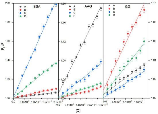 The quenching mechanisms of BSA, AAG, or GG fluorescence in the presence of studied compounds could be either static or dynamic. To determine the quenching mechanism, the studies were conducted at three temperatures: 297, 303, and 308 K. The obtained data were processed according to the Stern–Volmer Equation (1). The inner filter effect was corrected using Equation (2):
