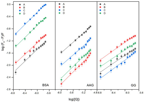The Stern–Volmer regression plots (top) double logarithm plots (bottom) for quenching of BSA, AAG, and GG caused by the additive A–D compounds.