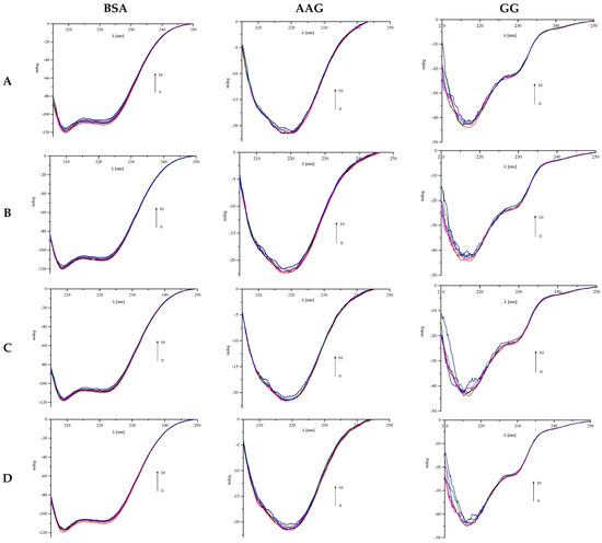 CD spectra of proteins: BSA, AAG, and GG after adding the appropriate portions of the tested ligands A, B, C, and D.