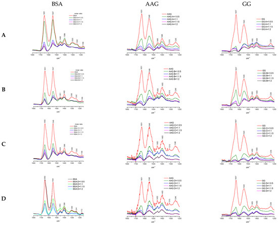 The infrared spectroscopy (IR) method combined with the mathematical algorithm of Fourier self-deconvolution (FSD) is wildly used to study the conformational changes in secondary structures of proteins. This approach was extensively utilized to analyze many biological fluids. The characteristic vibration of chemical groups in peptides and proteins reveal particular transmittance/absorption bands in the spectrum, namely Amide A (~3300 cm−1), Amide B (~3100 cm−1), and Amide I–VII (with respective positions ~1650 cm−1, ~1550 cm−1, ~1300 cm−1, ~735 cm−1, ~635 cm−1, ~600 cm−1, ~200 cm−1) [39,40,41]. Amide A and B signals originate from NH stretching vibration. The Amide I peak appears, first of all, as a result of stretching the C=O group, but also with contribution C–N stretching, C–C–N deformation, and N–H bending in-plane, whereas Amide II is caused mainly by N–H bending in-plane, and additionally by C–N stretching with contribution C–O bending in-plane and C–C and N–C stretching [39,41,42]. The secondary structure of a protein is related to the spatial arrangement of the peptide bonds chain and also interaction with adjacent amino acid residues in the sequence. However, Amide I is the most sensitive and the most conventional band to verify the conformation changes in protein [43,44]. It chiefly depends on peptide bond vibrations. The remaining Amide bands (III-VII) are not so important and useful in the analysis of the conformational structure of proteins because they mainly result from side-chain interactions of individual amino acids and other weak interactions such as hydrogen bonds. The free serum blood proteins were characterized by a unique IR spectrum, in which most variable regions 1800–1200 cm−1 are presented in Figure 12. The Amide I band for examined BSA, AAG, and GG was observed at 1651 cm−1, 1631 cm−1, and 1637 cm−1, respectively. In addition, the Amide II signal exhibits high intensity peak at position 1547 cm−1 for BSA, 1549 cm−1 for AAG, and 1543 cm−1 for GG. In contrast, the Amide III band is only observed for BSA at 1300 cm−1 is very weak for AAG at 1315 cm−1, and absent in the GG spectrum. The study of the interaction of phthalimide analogs with individual proteins was carried out by monitoring the changes in the peak intensity of Amide I and Amide II in various molar ratios. The general conclusion is the increase in the concentration of the compounds caused a significant decrease in the intensity and shape of the Amide I and II bands. A slight shift in the peaks was also observed as shown in Figure 12. The most spectacular changes occurred until an equimolar amount of protein and ligand was achieved. The compounds A and D did not exert any significant effect on the Amide bands of BSA after the addition of the first portion, unlike compounds B and C. On the other hand, in the interaction with GG, a drastic reduction in the absorption of these bands was observed. The result of a decreased intensity of peaks assumes the variation in the protein secondary structure. The next step was to bring under quantitative analysis Amide I peak for spectra with equimolar amount of compounds and proteins.