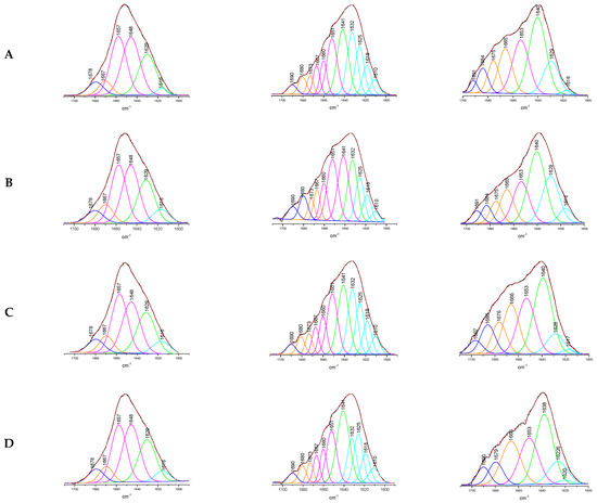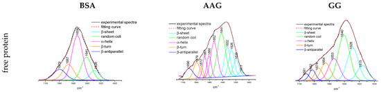 Moreover, the FT-IR spectra were brought under analysis according to the procedure by Byler and Susi [43]. The fragment with the Amide I peak at 1650 cm−1 was extracted after the normalization of each spectrum. The major peaks were selected from the second derivate. The signal position is correlated with the following structures: α-helix (1660–1650 cm−1), β-sheet (1640–1610 cm−1), β-turn (1691–1680 cm−1), β-antiparallel (1660–1650 cm−1) and random coil (1650–1640 cm−1) structures [39,40,41]. The self-deconvolution was conducted on the Amide I bands. The Gaussian function curve-fitting was performed, and the total area under the peak was determined. The percentage of area under peaks corresponds with the contribution of the secondary structure of the protein. In this work, the monitoring of detailed changes in the Amide I band was presented in Table 8 and Figure 13.