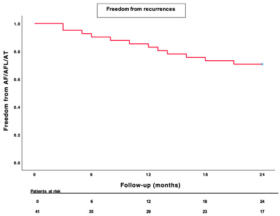 This was an observational, prospective, single-center study. The patients’ clinical characteristics are reported as descriptive statistics. Continuous variables are expressed as the mean ± standard deviation. The categorical variables were summarized as percentages. A p-value of <0.05 was considered to be statistically significant. Arrhythmia-free (AF/AFL/AT) survival curves were generated by the Kaplan–Meier method for illustrative purposes. All statistical tests were performed using SPSS for Windows 25.0 (SPSS, Chicago, IL, USA).