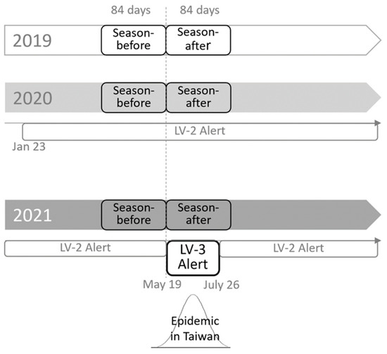 This retrospective cohort study was conducted at Taichung Veterans General Hospital (VGH) between 2019 and 2021. The Lv3 alert was issued on 19 May for the COVID-19 epidemic. Based on the different observation years, we enrolled patients into three study groups, which corresponded to three distinct scenarios of COVID-19 outbreaks: no COVID-19 cases (cohort-2019), only small-scale and local COVID-19 outbreaks with an Lv2 alert in Taiwan (cohort-2020), and with a COVID-19 epidemic and Lv3 alert in Taiwan (cohort-2021). The longest duration for refilling prescriptions was 12 weeks in Taichung VGH; therefore, the study period in each year was divided into season-before and season-after according to the start date of the Lv3 alert on 19 May 2021. The season-before was defined as the 12-week period before 19 May (i.e., between 14 February and 18 May), and the season-after was defined as the 12-week period following 19 May (i.e., between 19 May and 10 August). The study design is illustrated in Figure 1.