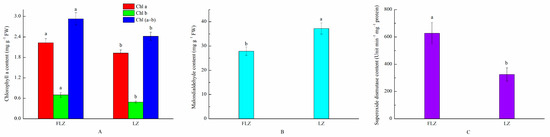 Content of chlorophyll (A), Malondialdehyde (B), and Superoxide dismutase (C) in FLZ and LZ C. tangshen leaves. The different letters indicate significant difference at the 0.05 probability level.