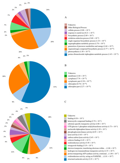 GO analysis was conducted to reveal the representation of proteins in response to continuous cropping based on p-values (FDR) < 0.05. Seventy DEPs were subdivided into categories of biological processes (BP), molecular functions (MF), and cell compositions (CC) (Figure S2). The Venn diagram in Figure S2 shows the number and overlap of proteins involved in the interactions of the three categories. In addition, enrichment for all GO terms indicated that 10 terms were significantly enriched in biological processes, such as the purine ribonucleoside triphosphate metabolic process, purine ribonucleotide metabolic process, purine ribonucleoside metabolic process, ribonucleoside triphosphate metabolic process, and purine nucleoside triphosphate metabolic process (Figure 2). In the cell components, 10 terms were largely enriched, including chloroplast, chloroplast thylakoid membrane, chloroplast thylakoid, plastid, and chloroplast part (Figure 2). In molecular function, the most enriched 10 terms included ATPase activity, proton-transporting ATP synthesis activity, NADH dehydrogenase (ubiquinone) activity, NADH dehydrogenase (quinone) activity, and rRNA binding (Figure 2).