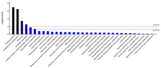 KEGG is a manually curated pathway database. According to the KEGG database, pathways are clustered into the following sub-categories, (A) Metabolism, (B) Genetic Information Processing, (C) Environmental Information Processing, (D) Cellular Processes, (E) Organismal Systems, and (F) Human Diseases. Enrichment analysis of KEGG pathways was performed with the same hypergeometric algorithm used in the GO enrichment analysis. To determine which pathway was active in the sample of continuous cropping plants, 70 DEPs were clustered into 33 KEGG pathways (Figure S3), and these proteins were significantly involved in pathways such as metabolic pathways, photosynthesis, oxidative phosphorylation, carbon fixation in photosynthetic organisms, phenylalanine metabolism, and ribosome based on p-values (FDR) < 0.05 (Figure 3).