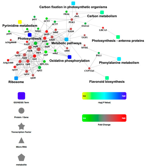 In order to further examine the comprehensive information obtained from the identified DEP data, we analyzed the PPI network. The network model was generated using the Cytoscape Web application based on four levels of functional analysis: fold-change of gene/protein expression, PPI, KEGG pathway enrichment, and biological process enrichment. A merged network is shown in Figure 4. In the network, the up-regulated proteins are indicated with red circle nodes and the down-regulated proteins are indicated with green circle nodes. A total of 40 DEPs, made up of 15 up-regulated and 25 down-regulated proteins, were involved in PPI. These proteins were related to 10 functional pathways: metabolic pathways, ribosome, oxidative phosphorylation, photosynthesis, carbon fixation in photosynthetic organisms, carbon metabolism, phenylalanine metabolism, pyrimidine metabolism, photosynthesis, and flavonoid biosynthesis.
