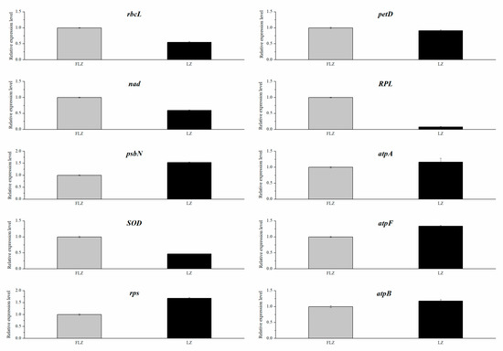 The proteome results were validated by analyzing the expression of ten genes related to stress responses using qRT-PCR. The results indicated that the expression level of the five up-regulated genes (RPS, psbN, atpA, atpB, and atpF) was significantly higher in the LZ group than in the FLZ group. However, as shown in Figure 5, LZ greatly inhibited the expression of the five downregulated genes (rbcL, nad, SOD, pet D, RPL), compared with the FLZ. In summary, the expression profiles of these genes from the qRT-PCR were consistent with that from the proteome, indicating that the proteome data were reliable and accurate.