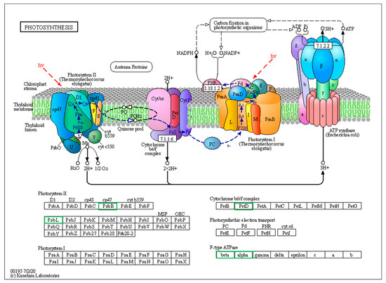 Photoreaction and the Calvin cycle are critical reaction pathways of photosynthesis. Further analysis identified 28 differentially expressed proteins involved in photoreaction and the Calvin cycle. The significantly expressed DEPs relating to photoreaction included ATP synthase, photosystem II protein (psbB), chlorophyll a-b binding protein (Lhc), and cytochrome b6-f complex subunit (Figure 6). Of the 11 photoreaction-related proteins identified, nine were down-regulated, including six ATP synthase subunit, one photosystem II protein, one chlorophyll a-b binding protein, and one cytochrome b6-f complex subunit, which basically covered the whole process of photoreaction. The F-ATP synthase complex, which consists of Fo and F1 sectors, plays a pivotal role in energy-converting membranes and energetic demand to counteract abiotic stress [23]. Since ATP produced by photoreaction is required for carbon dioxide fixation in the Calvin pathway [24], down-regulated ATP synthase consequently caused limited energy provision utilized during carbon dioxide fixation.