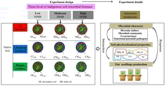 In this study, different levels of ISMB were created using different autoclaved treatment: non-sterile soil (high level [H]), mixture of half non-sterile soil and half completely sterile soil (moderate level [M]), and completely sterile soil (low level [L]). Three fertilizer types (no fertilizer [N], chemical fertilizer [C], biogas residues [O]) and two soil habitats (bulk soil [SB] and rhizosphere soil [SR]) were studied (Figure 1). All 19 experimental treatments (3 levels of ISMB × 3 type of fertilizer × 2 type of soil habitat and one native soil) were conducted on three replicates for each soil sample (100 g soildry matter). For the O treatment, 1000 g dry soil and 0.2 g biogas residues were used, and 0.1 g/kg N was added using biogas residues. For the C treatment, chemical fertilizer (nitrogen, phosphorous, and potassium) was applied using the same amount of nitrogen, phosphorous, and potassium as that of the O treatment (0.1 g/kg N, 12.53 mg/kg P, 20.81 mg/kg K). The physical and chemical properties, total bacterial and fungal diversity, and composition of the soil were then analyzed after one cropping (30 days).
