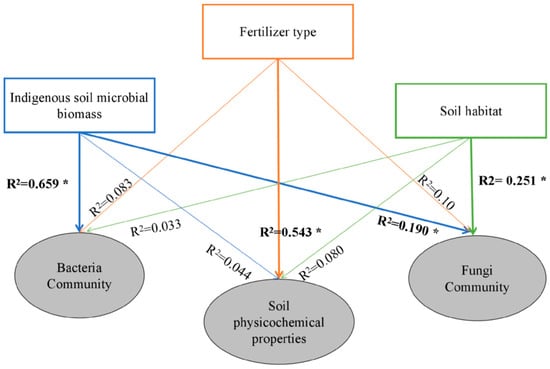 Effect of soil microbial biomass, fertilizer type, and soil habitats treatment on the differentiations of soil physicochemical properties and bacterial and fungal communities based on PERMANOVA. Value in bold indicates a significant difference at p < 0.05. * p < 0.05.
