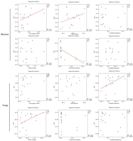 An analysis of similarities (ANOSIM) showed that the level of ISMB produced the most substantial effects on diversity of bacterial and fungal communities with regard to the OTU level compared with application of different types of fertilizer and soil habitat effects. PCoA (principal co-ordinates analysis) of the unweighted UniFrac distance between samples revealed a stronger degree of clustering of established microbial communities of both bacteria and fungi according to their level of ISMB (Figure S2). The bacterial community differed significantly between ISMB (p = 0.001, R2 = 0.659), and the fungal community differed significantly between ISMB (p = 0.008, R2 = 0.251) and soil habitat (p = 0.004, R2 = 0.190; Figure 2). Linear regression analyses of the physicochemical properties and microbial OTUs are shown in Figure 3. In general, the soil physicochemical properties (total organic carbon, total nitrogen, available phosphorus, and nitrate nitrogen) positively correlated with relative abundance of bacteria and fungi. However, the ammonia nitrogen was negatively associated with relative abundance of bacteria (p < 0.05). According to the significant results of statistical analyses, microbial community, co-occurrence, and functional potential pathogens group changes affected in order of ISMB levels, fertilizer type and soil habitat are presented in detail as follows: