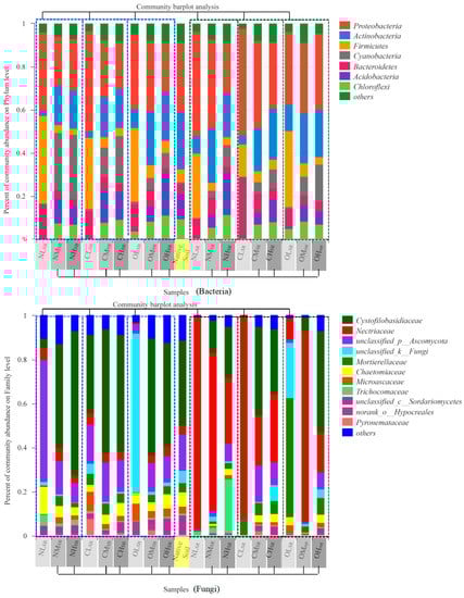 Community composition of native soil and restored microcosms. Microcosms established in bacterial communities (at the phylum level) and fungal communities (at the family level) of soils treated with different fertilizers.