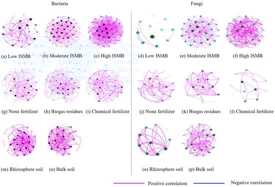 These networks visualize different soil microbial biomass treatment effects on the co-occurrence pattern between bacterial taxa at genus level with relative abundances greater than 0.1%, and fungal taxa at family level with relative abundances greater than 0.001% in soils. The node size is proportional to abundance of taxa, and the edges are colored according to interaction types. Positive correlations are labeled with pink, and negative correlations are labeled with blue.