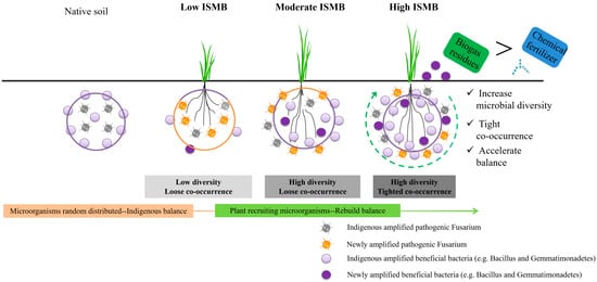 This study showed that in the presence of higher levels of ISMB, the oat seedlings produce more, and the abundance of soil microorganisms is richer. A close relationship between plant and microorganisms was demonstrated by Oates et al. [46], who showed that the composition of plant community can strongly influence soil microbial community. When vegetation was restored to the soil bacterial community structure, the co-occurrence pattern was changed in a karst rocky desertification area [47]. Similarly, the root exudates of maize and soybean also changed the soil bacterial community structure [48]. Once plant growth is threatened, plants will seek help from soil microorganisms and gather beneficial microorganisms for disease resistance [8]. These studies all indicated that plant root exudates may act as activators for microorganisms, which can stimulate different physiological and biochemical reactions of microorganisms. Thus, the indigenous microbial balance of native soil would be fragmented when the plant was considered. The interaction of plant microorganisms is the focus of research under different ISMB levels following application of different types of fertilizer (Figure 6). When the level of ISMB is low, as shown in this study, one cluster of species such as Nectriaceae that responds positively will dominate the microbial community. This condition could destroy the balance of soil microorganisms, resulting in low diversity, loose co-occurrence, and low crop production. Some research has indicated that higher amounts of Nectriaceae are dangerous for soil health and can cause a severe disease of black root rot [49]. Plant secretions have different effects on microorganisms, and microorganisms respond to them in varying ways with different rates of reactions and propagation. However, when the ISMB level is higher, even if the microorganisms that are slow to respond to plants do not gather and reproduce as fast as those microorganisms that respond quickly, there are enough members of indigenous populations to balance the newly added microorganisms, which will not lead to an imbalance of the soil micro-ecological environment. Moreover, we found that although moderate levels of ISMB increase the microbial diversity, they lose the co-occurrence. Only when the ISMB reach their highest level are diversity and co-occurrence both maintained in an excellent state. Of course, it is easier to maintain a balance if biogas residue is applied with beneficial microorganisms compared with chemical fertilizers. The genus Fusarium includes many pathogenic species causing a wide range of plant diseases [50,51] so that we discuss the interactions between Fusarium and other key bacteria to analyze the character of different fertilizers. Our study clearly found that the key bacteria that maintain co-occurrence patterns of biogas residues have a negative relationship with the Fusarium (Table 4). Also supporting this argument is the knowledge that Bacillaceae are abundant in soils created during organic farming and could be used as the first line of defense against soil-borne fungal pathogens, particularly some Fusarium [52,53]. Previous studies indicated that chemical fertilizer clearly disconnects the dependency of plants from many plant-enhancing microbial processes to deleteriously change the degree of microbial diversity [33]. In our study, the disconnect caused by chemical fertilizer may be achieved through a decrease in the degree of microbial diversity, which further changes the microbial co-occurrence pattern. In addition, most key bacteria maintain the co-occurrence pattern of a positive relationship of chemical fertilizers with the Fusarium (Table 4). Therefore, high ISMB combined with biogas residues was important to create a beneficial environment for plant growth. Different types of plant secretions vary in their effects on microbial recruitment. This study just researched the interaction between one soil and one type of crop under different amounts of microbial biomass. We suggest more opportunities to study the interaction with different microbial biomass in varying soil types and crops in more detail, so that specific fertilizers could be produced with the plant recruitment microorganisms for different crops, which can be applied to uphold the balance of soil ecosystem and continuously produce crops.
