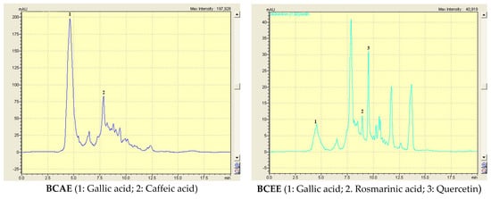 The yield obtained by maceration using ethanol (27.34%) was greater than that obtained by diffusion in water (17.50%). The concentrations of TPC, Fl and CT in the extracts of B. cinerea extracts were determined (Table 1). The concentrations of phenolic compounds were greater in the ethanolic extract than in the aqueous extract (21.06 and 13.09 mg of GAE/g extract, respectively, for BCEE and BCAE). These extracts are characterized by the presence of large amounts of condensed tannins expressed by mg tannic acid equivalents/g extract; this amount was 24.05 mg in the ethanolic extract. The analysis of BCAE and BCEE by HPLC-DAD allowed the detection of four phenolic compounds (gallic acid and caffeic acid in BCAE; gallic acid, rosmarinic acid and quercetin in BCEE) (Table 2 and Figure 3). Even if there are molecules that are not revealed, the above mentioned compounds were among the main molecules of the B. cinerea extracts.