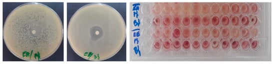The minimum inhibitory concentrations of the B. cinerea extracts against the three bacterial strains were revealed using the microdilution method according to the previously described methods []. After 24 h of incubation at 37 °C, the MIC endpoint was determined by the direct observation of the growth in the wells and by using the colorimetric method (TTC 0.2% (w/v)) [,].