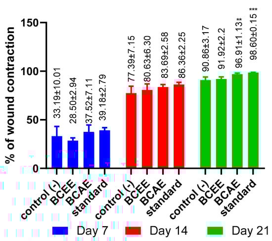 To our knowledge, this is the first study to report on the healing activity of extracts of B. cinerea, which have not been reported among the 12 species belonging to the Asteraceae family—species that are part of medicinal plants widely used in the treatment of wounds in the Mediterranean region []. An evaluation of the healing activity of a plant species belonging to the asteraceae family and using the same burn model with an extract of Ditrichia viscosa shows a remarkable wound contraction (99.28%) after 21 days of treatment []. The healing efficacies of some species of asteraceae can be attributed to their antibacterial effects, which provide protection of the microenvironment and damaged wound tissue against pathogenic bacterial strains [].